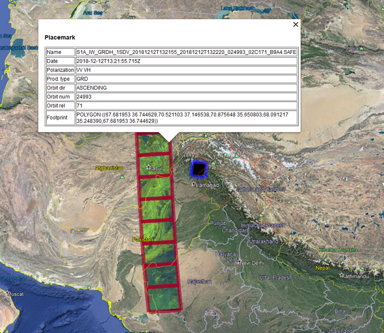 Small previews will be downloaded in the output folder instead of the full size SAR data. Note: Preview mode is supported for Sentinel-1 SLC, RAW and GRD images. Each preview is composed by a .png file containing the quick view image and a .kml file, which contains the footprint polygon and the quick view .png draped. By clicking on the footprint polygon, the following information are displayed: Satellite ID, Acquisition mode, Polarization, Orbit Direction, Absolute Orbit, Relative Orbit and filename. This is helpful in case only one track has to be downloaded but the relative orbit is not known a priori. Defining a region of interest and entering in the Preview Mode allows the user to have an overview of all the acquisitions on the interested area. Afterwards, based on these new acquired information, the search parameters can be adapted in order to match the desired request and the preview mode can be disabled (Preview Only = FALSE) in order to download the SAR data.