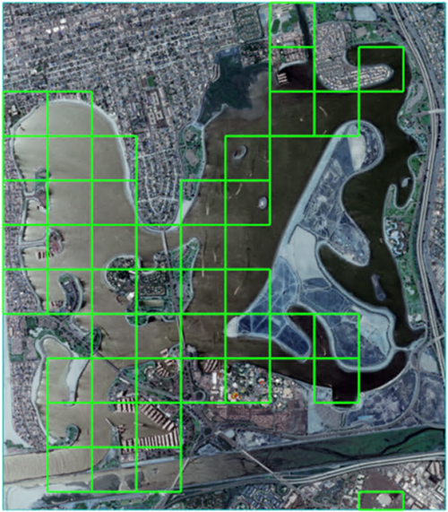 The output classification vector displays on top of the raster used for classification. Green boxes appear around areas containing features of interest. The following image shows an example of a grid vector overlaid on the raster used during classification. Areas that do not contain a grid cell (the green boxes) represent areas where no features were detected for the specified confidence threshold. This example uses the ENVI Deep Learning Grid Tutorial data with a confidence threshold of 0.90, searching for small boats.