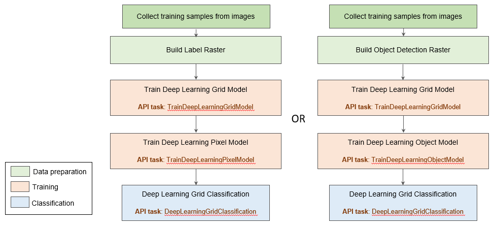 The flowchart below shows the steps of the Optimized Object Classification and Optimized Pixel Classification processes that include grid: