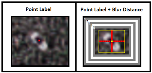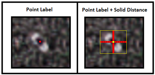 Solid distance compensates for point labels by extending a point in four directions by the number of pixels specified for solid distance. The example image below shows a standard point label comprised of a single pixel roughly centered on the feature (left) and the original point label in yellow (right), with six red pixels extending up, down, left, and right of the point. The yellow box represents the actual data viewed during training, which is a label patch with dimensions 13px * 13px * nBands.