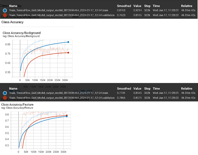 Similarly, viewing the class accuracies in TensorBoard shows they are still ascending toward 1. In the image below, Class Accuracy/Background (top) refers to everything that was not a feature. Class Accuracy/Feature (bottom), refers to the accuracy of all features learned, regardless of the number of classes.