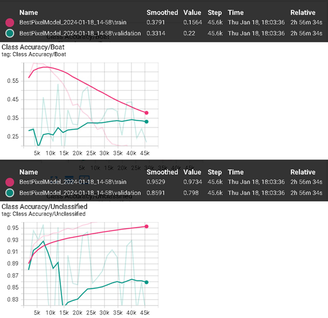 In the image below, class accuracy for boat is declining for training and slowly increasing for validation. While unclassified is ascending, background data for this example is easier to learn than the single boat class.