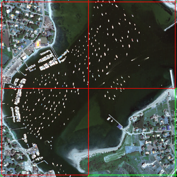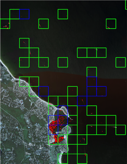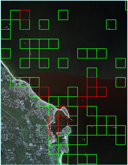 This section steps you through how to process an image using a grid model combined with object detection or segmentation model to perform optimized classification (patent pending). You will leverage both a trained grid model and a trained pixel segmentation model to identify small boats. Optimized pixel segmentation is the process of tipping a more advanced model such as pixel segmentation, using a grid model. Grid only knows whether a learned feature exists in portions of the grid. Pixel segmentation only knows pixel based segmentation for the features learned. Together they can quickly avoid unnecessary processing and focus on regions containing the target feature.