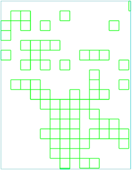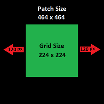 The following illustration shows a grid cell size of 224 (green) and a patch size of 464 (black). Pixel patches of patch size are center over grid cells of grid size. When running an optimized classifier, the pixel model will extend 120 pixels outside the grid targeted area. Doing this allows for potential false positives beyond the grid location, but could also provide classification context beyond the grid for features on the edge of the grid cell. Limiting the extent of the patch size to 16 or 32 pixels outside the grid can improve classification results by reducing false positives.