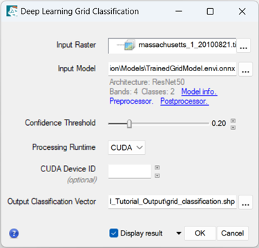 . navigate to Grid_Tutorial_Output, and select theBestGridModel.envi.onnxfor the grid model you trained earlier in this tutorial. Results for this section will be based on the grid model provided with the tutorial data, located inGrid_Tutorial_Data\Classification\Models\TrainedGridModel.envi.onnx. -