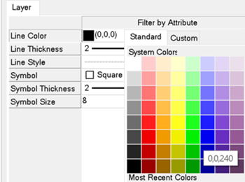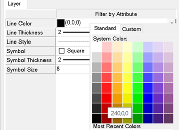 To easily visualize the filtered attributes by confidence value, change the line color for filtered records. Ensure Filter is selected in the Layer Manager. In the Layer tab below the ENVI Toolbox, click Line Color and change this to a blue color.