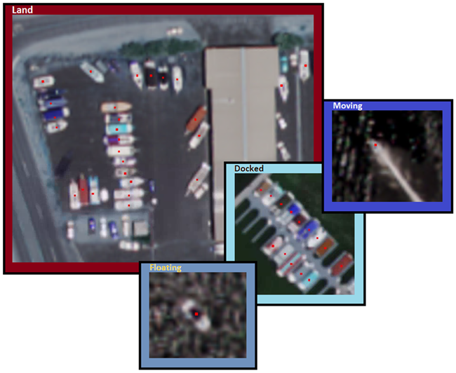 A single boat class was used for all labels in the dataset, multiple views of the feature were labeled. In the example image below, from training raster lr_arizona_1.dat_504060763.dat, you can see points over boats on land, floating, docked, and moving in open water. All boats were labeled using the ENVI Deep Learning Labeling Tool.