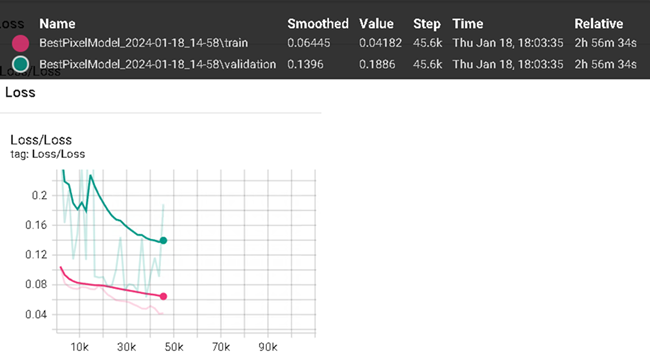 Viewing the loss value for pixel segmentation you will see validation is a bit jumpy. Training loss is still descending, meaning this model was still learning and has room for improvement.