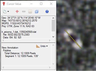 In the raster, click one end of a feature, then click the end of that feature that is farthest away. The Total Distance of the line displays in the Cursor Dialog. Below is an example of a boat used in this tutorial. Measuring front to back, the boat is roughly 12 pixels long. Based on the feature length, divide by two to determine the Solid Distance value, which in this case would be 6. A value of 6 is close to the average boat size and should represent the smaller dimension of your features. This means that if the Solid Distance value was set to 12 or 13, the model will not do well, particularly where boats are grouped next to each other (such as in docks).
