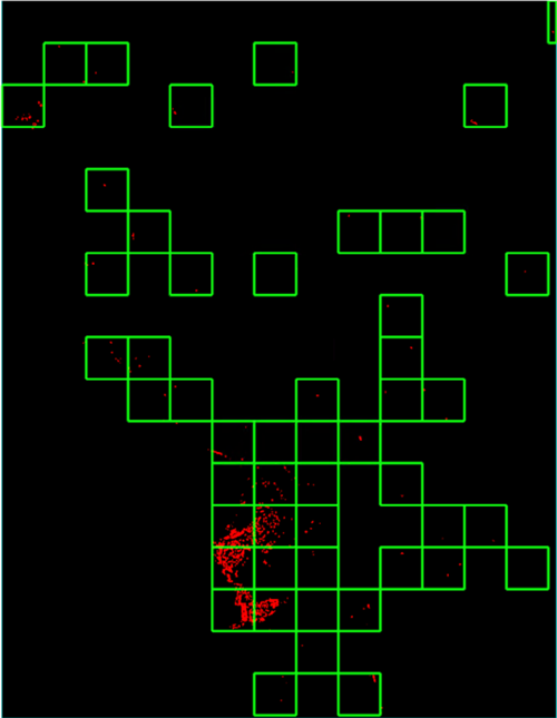 When running optimized classification, the grid will target areas of 448x448 containing features. Pixel classification will target features within the grid cell and extend outward by 16 pixels outside the grid boundary. This feature allows the pixel classifier to identify features on the outer boundary of the grid cells.
