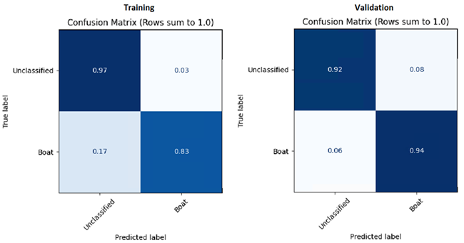 With only 25 epochs, the pixel segmentation matrices look decent, showing the model is converging. Parameter tuning and a longer training session will improve the overall model for classification. Notice the Unclassified and Boat labels in the image below. Unclassified represents class 0 or unlabeled background. Boat represents the labeled data class for this dataset.