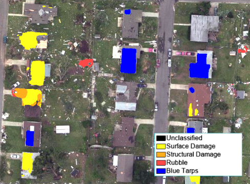 The following image shows a result of using the new, multiclass architecture to identify building damage after a tornado. You can see how the architecture captures the shape and outline of the blue tarps as well as identifies classes with indistinct boundaries.