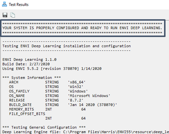 The Test Installation and Configuration tool was updated to run a small training session, which verifies that everything completes as expected. When finished, it displays a dialog that indicates whether or not your system is ready to use ENVI Deep Learning.