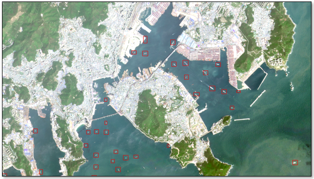 The following image shows an example of using object detection to locate ships. Red bounding boxes mark the locations of ships.