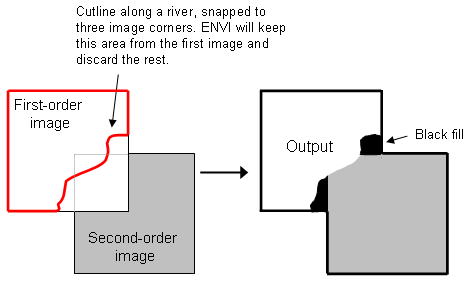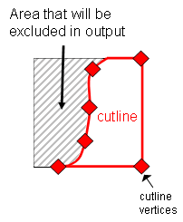 Cutlines are polygons that are used in combination with image ordering to define areas that you want to keep in the final output. They are typically used to hide seams in the final mosaic or to exclude poor quality regions and instead use higher quality regions that are lower in the image stack. A cutline is an inclusion polygon, similar to a cookie cutter applied to one or more images. Cutlines are often defined by drawing a line along a geographic feature such as a river or street, and snapping to the nearest image edges or corners to define a polygon. The following example shows a cutline for a single image: