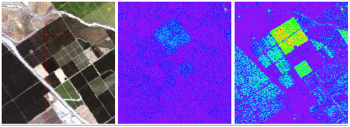 The following images show matched filter detection using image-derived spectra. On the left: Single pixel spectra selection. Center: Matched filter results without covariance regularization. On the right: matched filter results using covariance regularization (truncation). (Both matched filter images are scaled 0-1.)