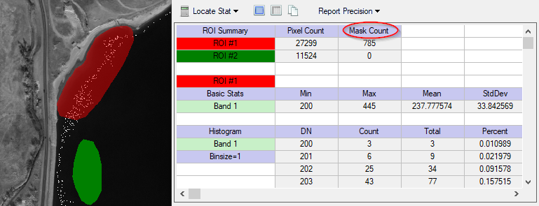 If one or more ROIs include pixels that are masked in the source image (i.e., they have a Data Ignore Value set), a new "Mask Count" column reports the number of those ROI pixels that were omitted from the statistics computation. The "Mask Count" column is located in the ROI Statistics dialog; for example: