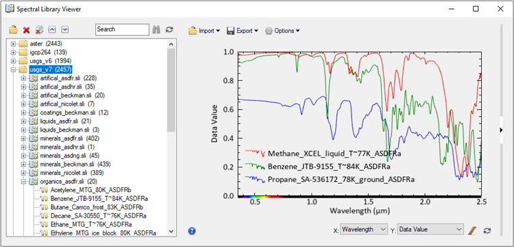 Use the Spectral Library Viewer to access and plot the USGS Version 7 spectra, along with the other spectral libraries that ENVI provides.