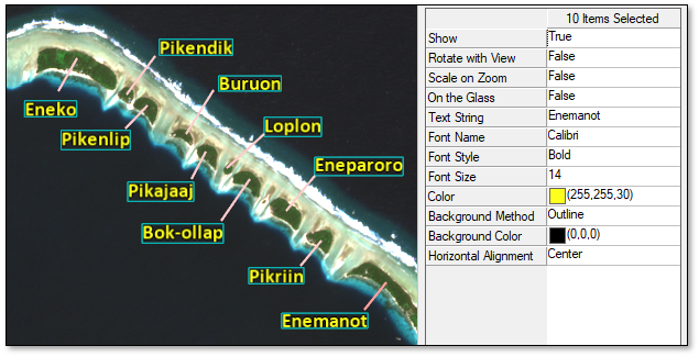 You can update the shared properties of multiple annotation items; for example, change the color of multiple text annotations. To do this, draw a box around the annotations in the current view, or use the Ctrl key to select multiple annotation items in the current view. Only the shared properties of the annotations are displayed in the lower-right corner of the ENVI application. Update the shared properties as needed.