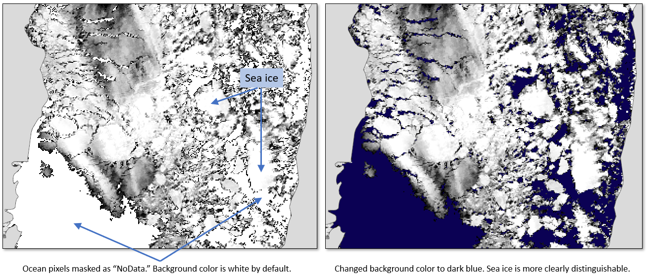 You can change the background color of the display by right-clicking on the View layer in the Layer Manager and selecting Change Background Color. Changing the background color can be helpful in distinguishing between bright features and pixels that have been marked as "NoData."