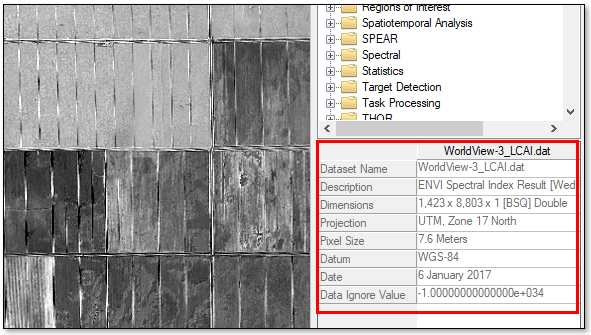 Properties of rasters, annotations, vector layers, contour lines, and grid lines are now displayed in the lower-right corner of the ENVI application below the ENVI Toolbox. You no longer have to double-click these items in the Layer Manager to view and edit their properties. An exception is with vector layers; right-clicking a vector layer and selecting Properties will display the same Vector Properties dialog as before so that you can edit properties of individual attributes.