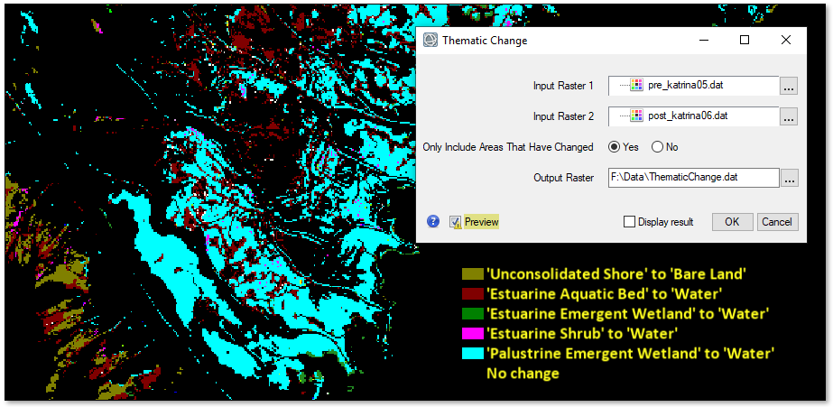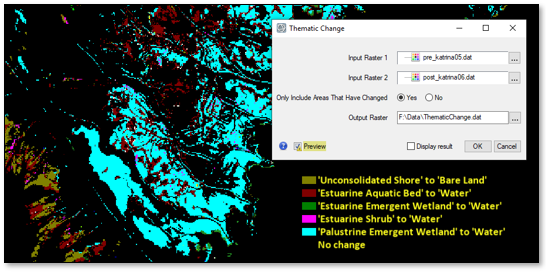 The new Thematic Change tool lets you identify differences between two classification images of the same geographic area taken at different times. This tool provides a quicker and simpler way to perform thematic change detection, compared to the Thematic Change Workflow.