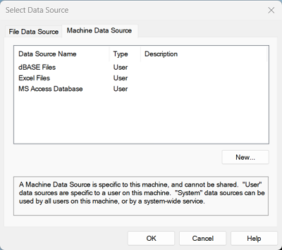 On Windows systems, click the New button to define a new data source for the system. (This button is not available on Motif systems.) The Create New Data Source wizard appears.