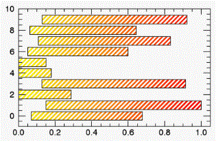 By default the barplot is filled with a solid color given by FILL_COLOR. By setting any of the PATTERN_ORIENTATION, PATTERN_SPACING, or PATTERN_THICK properties, your barplot will be filled with a line pattern. Set PATTERN_ORIENTATION to the angle (in degrees counterclockwise from horizontal) of the lines. The default is 0 degrees.