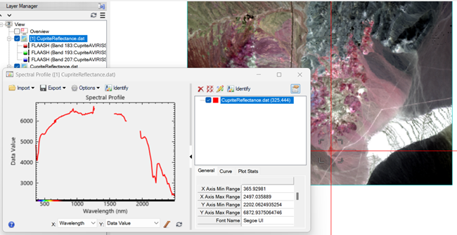 A common workflow in hyperspectral data analysis is to compare spectra derived from image data to those collected in the field or laboratory. This lets you quickly compare image spectra to the spectra of known materials. Absorption and reflectance features are easy to compare when the spectra are plotted in the same window.