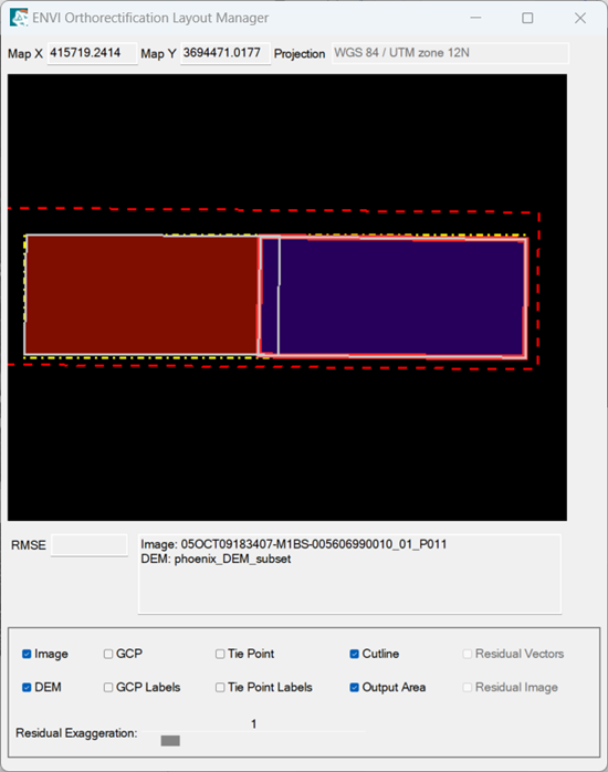 The controls in the Layout Manager to evaluate the overall model error are a powerful feature of Rigorous Orthorectification. As you interactively add, edit, or remove GCPs and tie points, the entire model is recomputed on-the-fly and your results are immediately visible in the Layout Manager. Note the RMSE (root mean square error) field that lists the overall model error. The current value should be 58.873389.