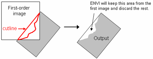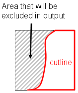 Cutlines are polygons that are used in combination with image ordering to define areas that you want to keep in the final output. A cutline is essentially an inclusion polygon, similar to a cookie cutter applied to one or more images. The following example shows a cutline for a single image:
