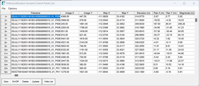 11. Use the GCP list to look for other GCPs with relatively high magnitude values. In addition to removing GCPs, you can also interactively update their geographic location as follows: