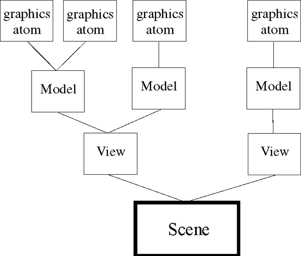 An Object Graphics display can be thought of as a group of graphics objects organized into a hierarchy or tree. For example, a graphics object tree with four graphics atoms (visualization objects) might be contained in three separate model objects, which are in turn contained in two distinct view objects, both of which are contained in one scene object, which is the root of the graphics tree.