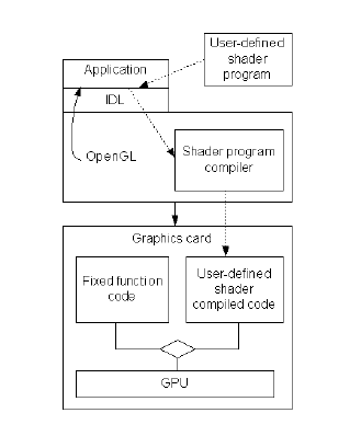 The interaction of a shader program within the graphics system is shown in the following figure. The graphics card GPU switches between executing fixed-function and shader program code.