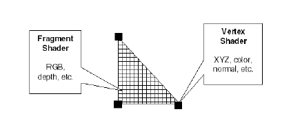 For the primitive shown in the previous figure, OpenGL calls the vertex shader three times, once for each corner of the triangle, and calls the fragment shader program once for every pixel covered by the triangle. Vertex attributes are interpolated across the fragments based on the vertex connectivity and the resulting distance of a fragment from a vertex.